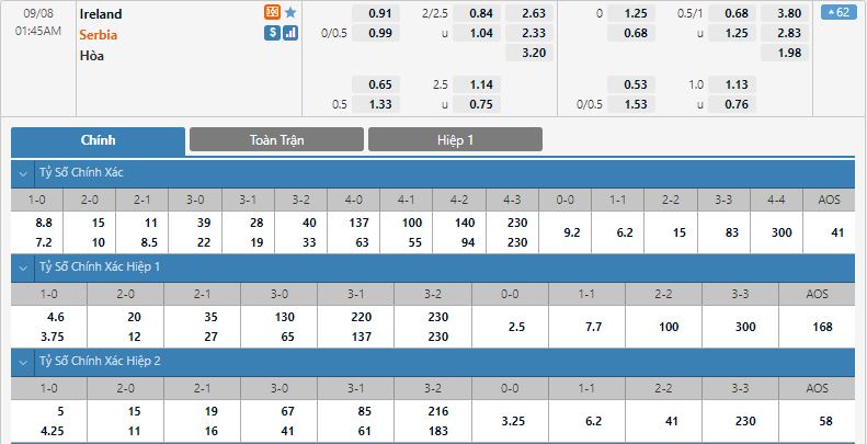 - Kèo tỉ số hiệp 2: Ireland 1-1 Serbia