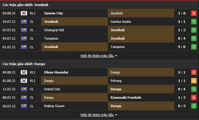 Phong độ gần đây Jeonbuk Motors vs Daegu FC: