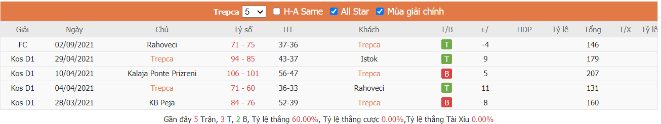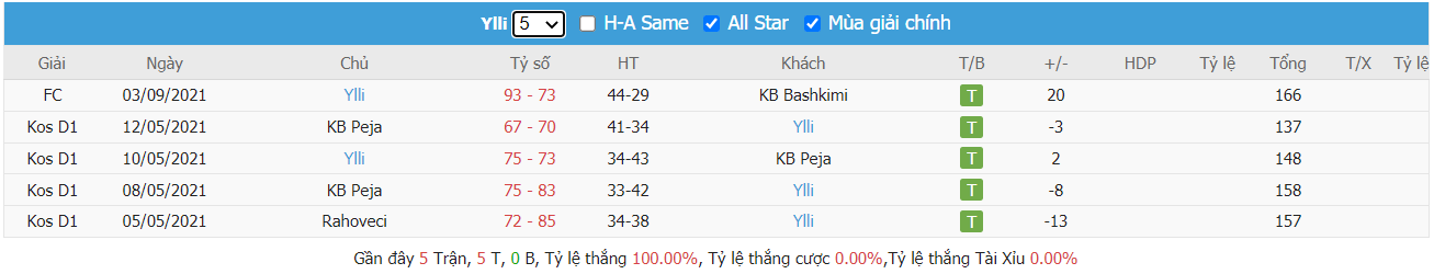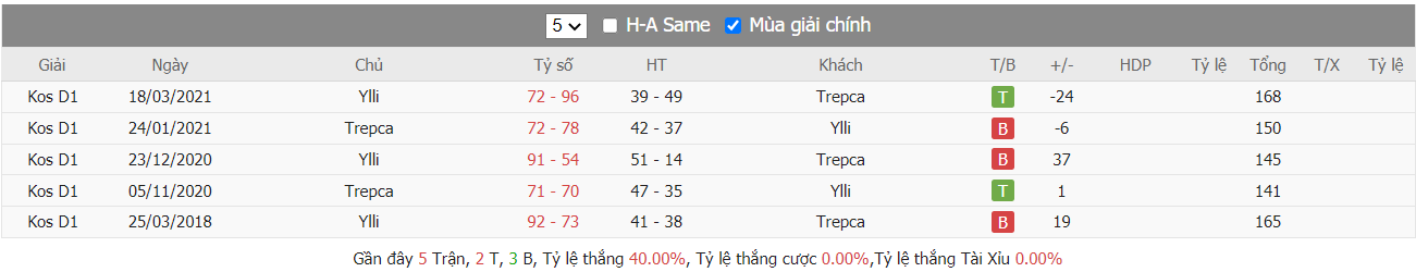 Thống kê cho thấy đây cứ trung bình mỗi trận sau tổng số 10 trận ra sân gần nhất KB Trepça cũng đều duy trì được sự phòng khoáng trong lối chơi khi mà trên hàng công đã ghi được trung bình tới 85 điểm mỗi trận và cũng đã để đối thủ bỏ vào rổ nhà trung bình tới 83 điểm mỗi. Từ đó dẫn tới 6 trên 10 trận đấu kể trên đều đã khép lại với các kết quả chung cuộc nổ tài. Vậy nên khả năng bùng nổ tỷ số ở trận tới cũng rất đáng được kỳ vọng khi mà cũng đã tới 7 trên 10 trận ra sân gần nhất của đội khách KB Golden Eagle Ylli cũng đều đã vượt qua mức kèo niêm yết theo TLCA. Đồng thời KB Golden Eagle Ylli cũng đã ghi được trung bình tới 87 điểm mỗi trận sau tổng số 10 trận ra sân gần nhất.