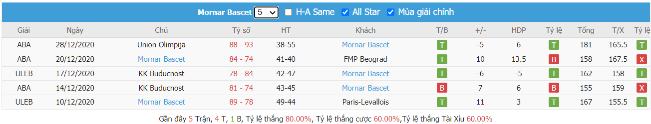 - Phong độ gần đây KK Borac Banja Luka vs KK Mornar Bar