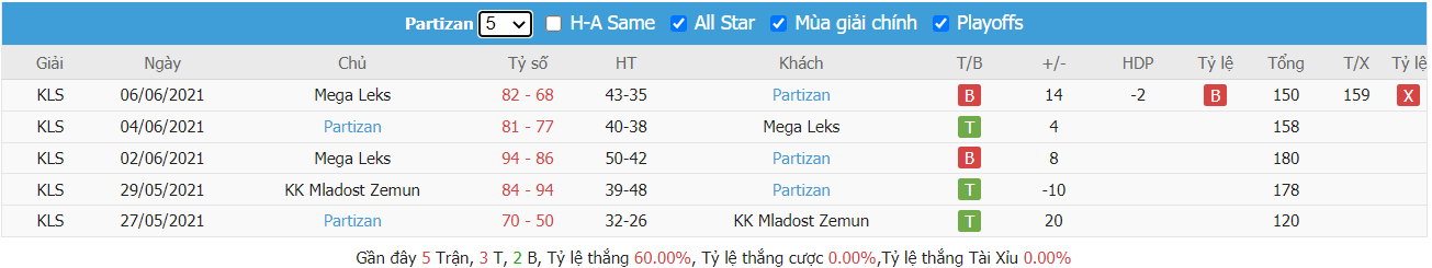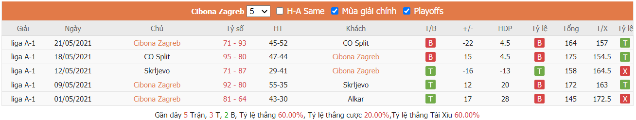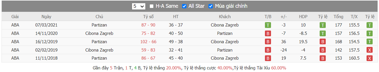 - Phong độ gần đây KK Cibona vs KK Partizan Beograd