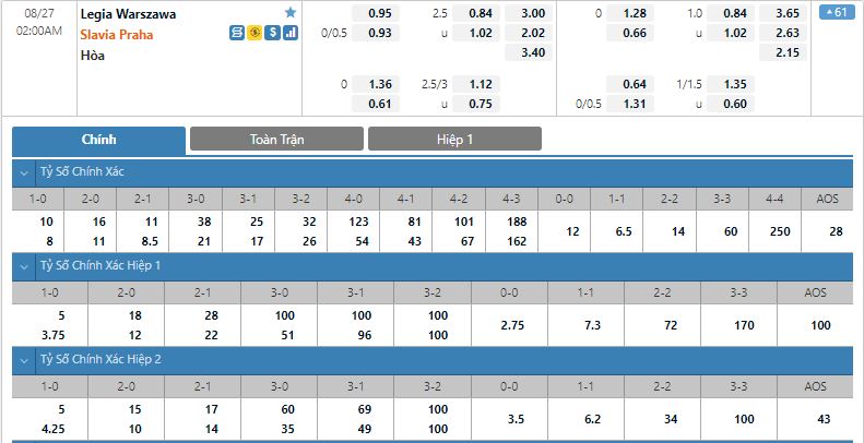 Bảng tỷ lệ kèo bóng đá Legia Warszawa vs Slavia Praha