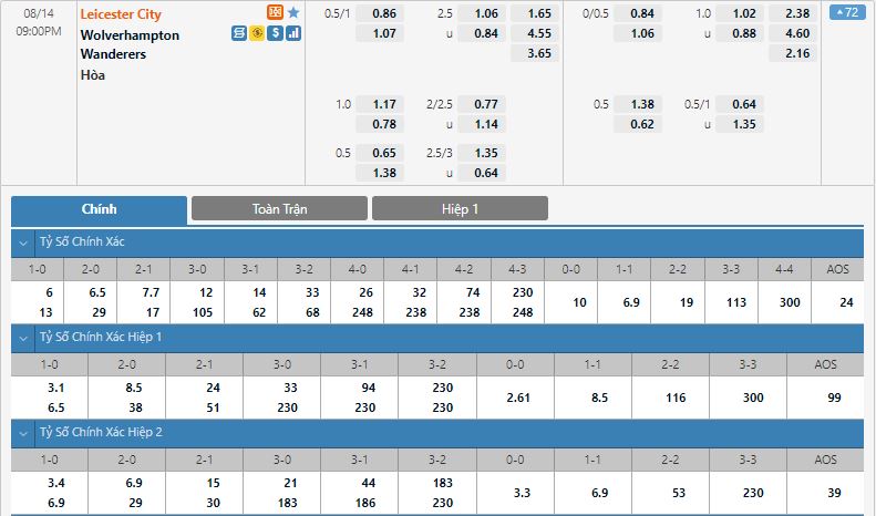Bảng tỷ lệ kèo bóng đá Leicester vs Wolves