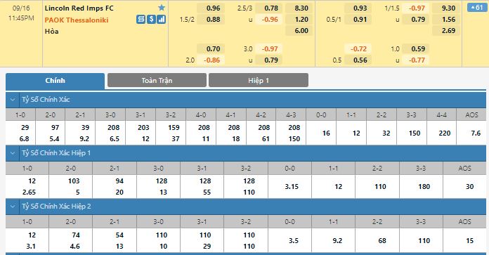 Bảng tỷ lệ kèo trực tuyến trận đấu Lincoln Red Imps vs PAOK: