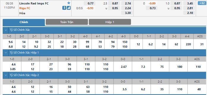 Bảng tỷ lệ kèo trực tuyến trận đấu Lincoln Red Imps vs Riga FC: