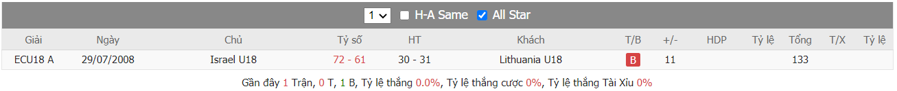 Thành tích đối đầu Lithuania U18 vs Israel U18