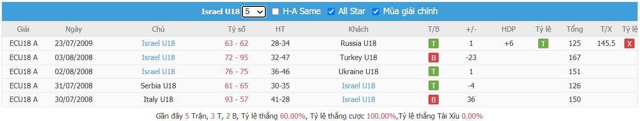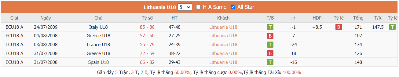 Thống kê cho thấy đây cứ trung bình mỗi trận sau tổng số 10 trận ra sân gần nhất Israel U18 cũng đều duy trì được sự phòng khoáng trong lối chơi khi mà trên hàng công đã ghi được trung bình tới 85 điểm mỗi trận và cũng đã để đối thủ bỏ vào rổ nhà trung bình tới 83 điểm mỗi. Từ đó dẫn tới 6 trên 10 trận đấu kể trên đều đã khép lại với các kết quả chung cuộc nổ tài. Vậy nên khả năng bùng nổ tỷ số ở trận tới cũng rất đáng được kỳ vọng khi mà cũng đã tới 7 trên 10 trận ra sân gần nhất của đội chủ nhà Lithuania U18 cũng đều đã vượt qua mức kèo niêm yết theo TLCA. Đồng thời Lithuania U18 cũng đã ghi được trung bình tới 87 điểm mỗi trận sau tổng số 10 trận ra sân gần nhất.