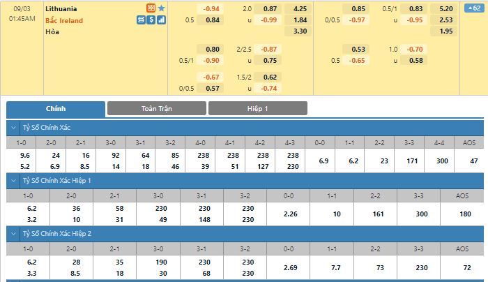 Bảng tỷ lệ kèo trực tuyến trận đấu Lithuania vs Bắc Ireland: