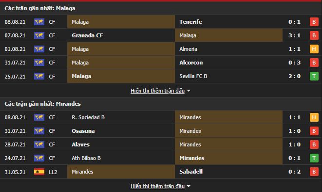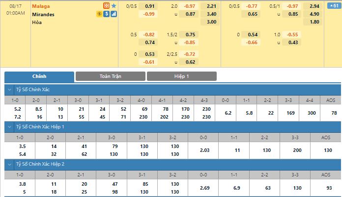 Nhưng Mirandes vẫn được kỳ vọng sẽ giành điểm ở trận đấu tới đây. Nói vậy bởi, kể từ năm 2015 đến nay, Malaga và Mirandes đã chạm trán nhau tổng cộng 6 lần. Kết quả cho thấy ưu thế nghiêng về Mirandes khi đội bóng này thắng 3, hòa 3. Kèo châu Á chủ nhà chấp 1/4 và tài xỉu 2 chọn đội khách và xỉu đặt kèo hợp lí hơn cả.