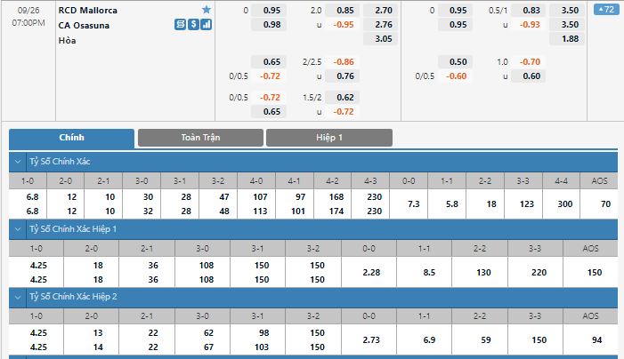 Bảng tỷ lệ kèo trực tuyến trận đấu Mallorca vs Osasuna: