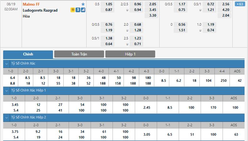 - Kèo tỉ số hiệp 1: Malmo FF 0-0 Ludogorets