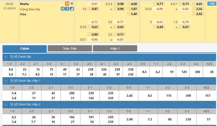 Bảng tỷ lệ kèo trực tuyến trận đấu Malta vs Cyprus: