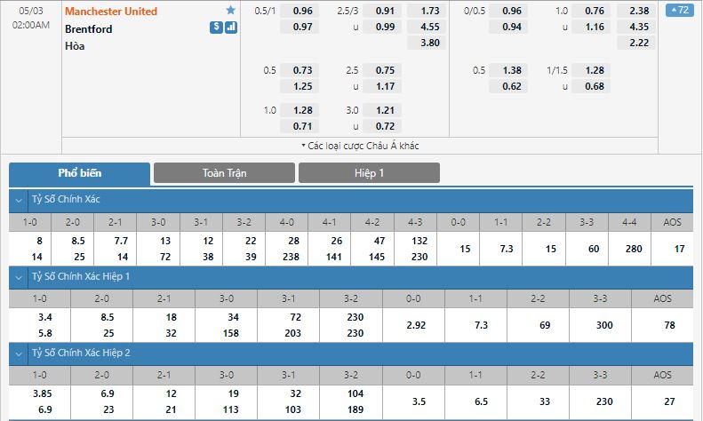 Bảng tỷ lệ kèo trực tuyến trận đấu Manchester United vs Brentford