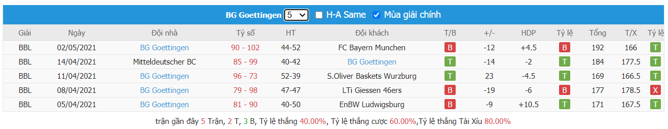 Phong độ gần đây Medi Bayreuth vs BG Goettingen