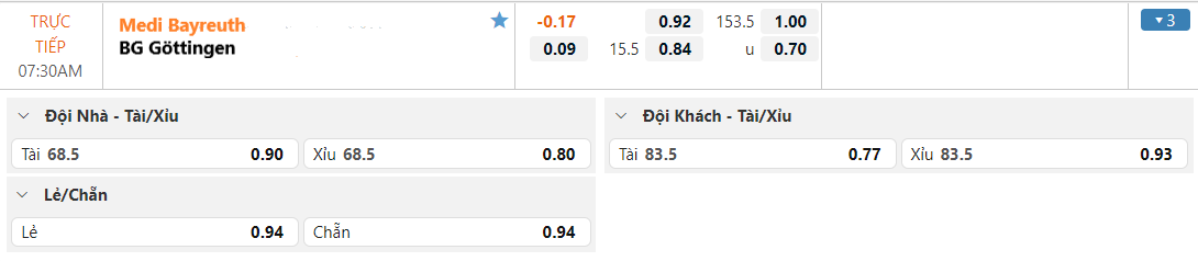 Bảng tỷ lệ kèo Medi Bayreuth vs BG Goettingen