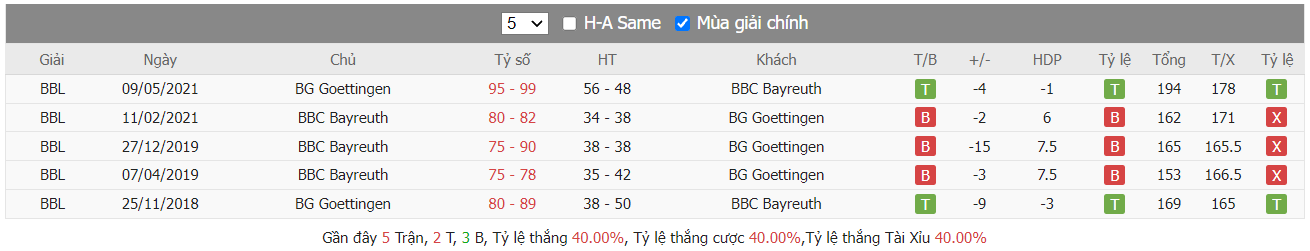 Thống kê về thành tích đối đầu của hai đội trong quá khứ, kết quả cho thấy dù không có được lợi thế sân nhà ở vòng đấu tới vẫn sẽ càng là một điểm tựa vững chắc cho BG Goettingen khi đã gìành được tới 6 thắng lợi trên cả thảy 7 trận so tài gần nhất của hai bên kể từ 11/2016 cho tới nay, trong đó cũng bao gồm được 3 trận được diễn ra trên sân nhà của BG Goettingen. Như vậy BG Goettingen hoàn toàn là sự lựa chọn sáng giá ở trận đấu tới với giới đầu tư.