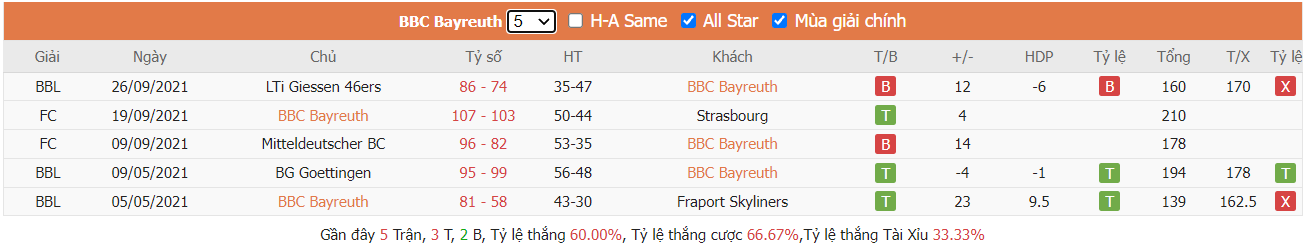 Thống kê cũng chỉ ra BG Goettingen cũng chỉ ghi được trung bình 75 điểm mỗi trận và cũng không duy trì được sự chắc chắn khi cũng đã để mất trung bình 75 điểm mỗi trận qua cả thảy 3 trận đón khách gần nhất. Như vậy dù được đánh giá cao ở trận tới nhưng BG Goettingen cũng không được tin tưởng sẽ ghi được nhiều điểm trước Medi Bayreuth. Trong khi đó với bất lợi về thành tích đối đầu và còn phải thi đấu trên sân khách nên Medi Bayreuth hoàn toàn không được đánh giá cao trong nhiệm vụ ghi nhiều điểm ở trận tới. Như vậy cửa xỉu vẫn là sự lựa chọn sáng hơn ở trận này, nhất là khi mà đã có tới 6 trên 7 trận gần nhất của Medi Bayreuth và 4 trên 5 trận so tài gần nhất của hai bên, tất cả cũng đã ghi nhận kết quả chung cuộc về xỉu.