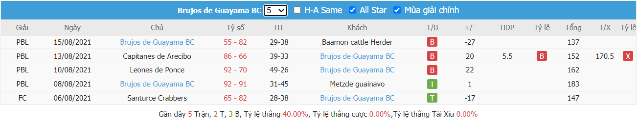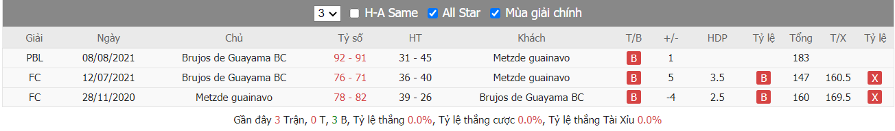 Thống kê cho thấy cả hai đội đều đang duy trì được phong độ thực dụng trong lối chơi khi mà trong cả 3 trận ra sân gần nhất Brujos de Guayama đều không thể ghi đươc trên 69 điểm mỗi trận đồng thời cũng không để mất quá 67 điểm mỗi trận, từ đó dẫn tới cả 3 trận đấu kể trên đều đã khép lại với các kết quả chung cuộc về xỉu. Trong khi đó Mets de Guaynabo cũng không quá khác biệt khi mà trong cả 3 trận ra sân gần nhất cũng chỉ bỏ được vào rổ đối thủ nhiều nhất lên tới 67 điểm mỗi trận và cả 3 trận này cũng đều không thể có các kết quả nổ tài.
