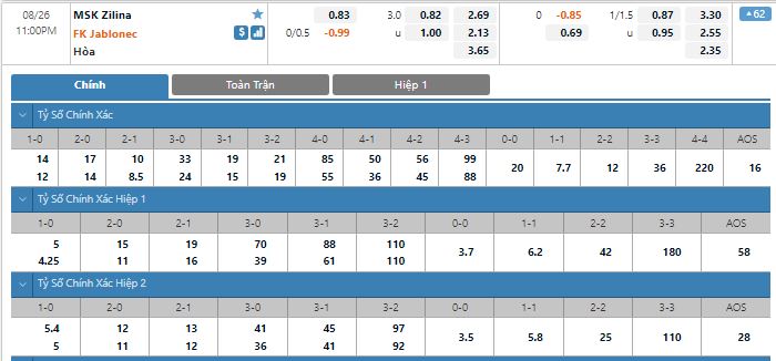 Bảng tỷ lệ kèo trực tuyến trận đấu MSK Zilina vs FK Jablonec:
