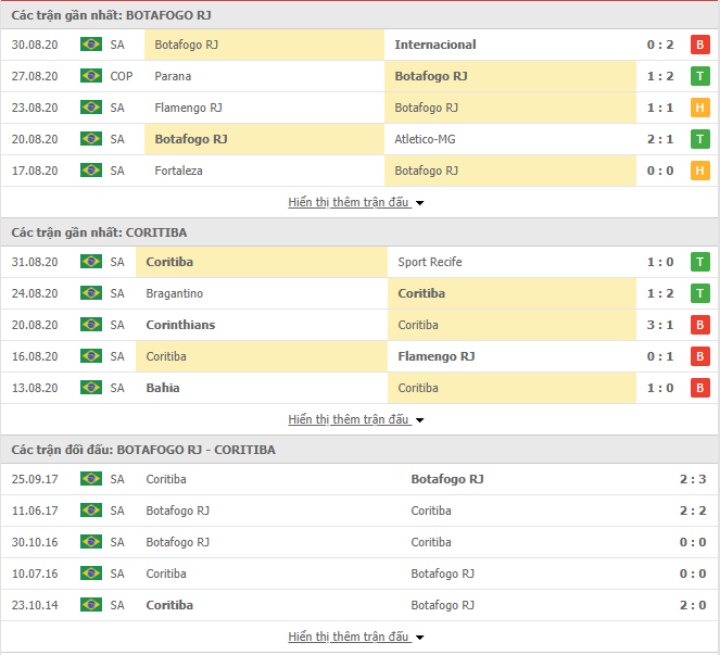 Thống kê phong độ & Lịch sử đối đầu Botafogo vs Coritiba