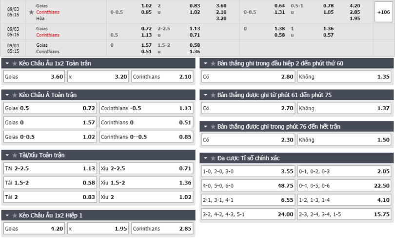 - Tỷ lệ kèo bóng đá Goias vs Corinthians