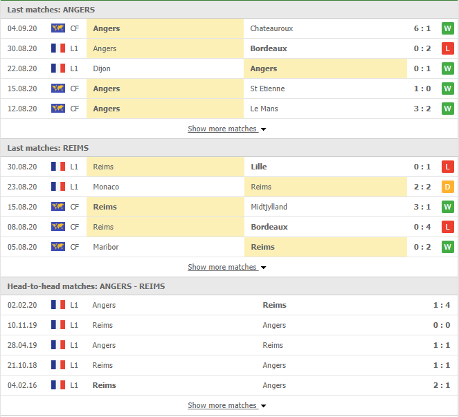 Tuy nhiên lịch sử lại đang đứng về phía thầy trò HLV David Guion khi thống kê từ 10 lần gặp nhau gần nhất cho thấy Reims có 4 chiến thắng, 5 trận hòa và chỉ phải nhận duy nhất 1 thất bại. Ở mùa giải năm nay, việc phải đối đầu với Monaco và Lille khiến thành tích của đội khách là chưa thực sự khả quan khi có 1 trận hòa cùng 1 thất bại. Trong khi đó ở phần sân đối diện, chủ nhà Angers sau chiến thắng trước Dijon trong ngày ra quân đã phơi áo trước Bordeaux ở vòng đấu vừa qua.