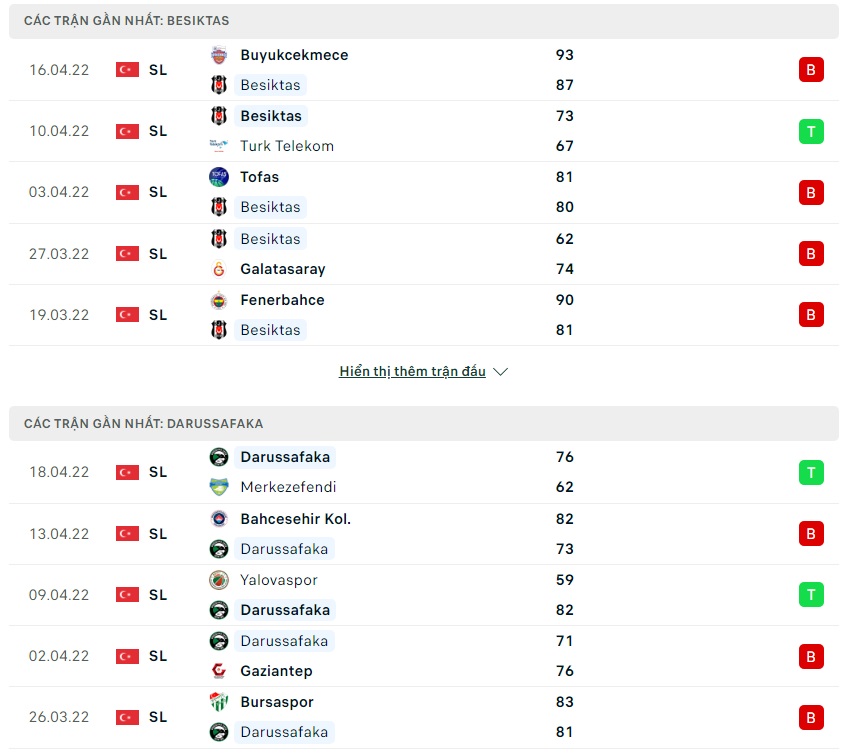 Phong độ gần đây Besiktas vs Darussafaka Tekfen