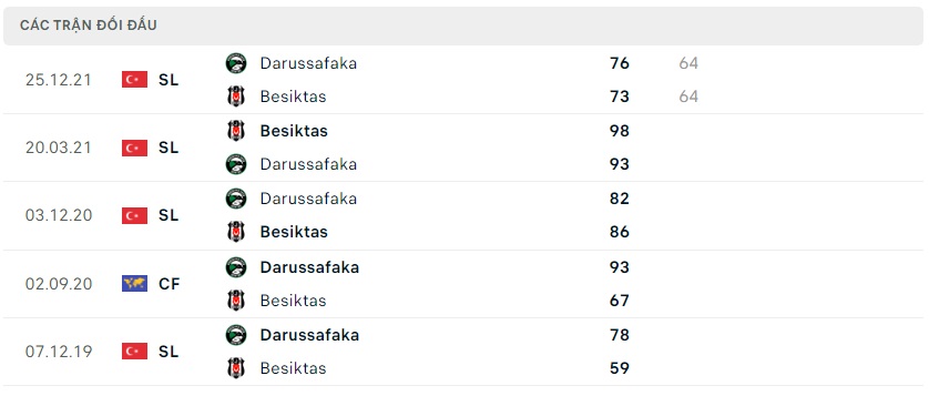 Lịch sử đối đầu Besiktas vs Darussafaka Tekfen