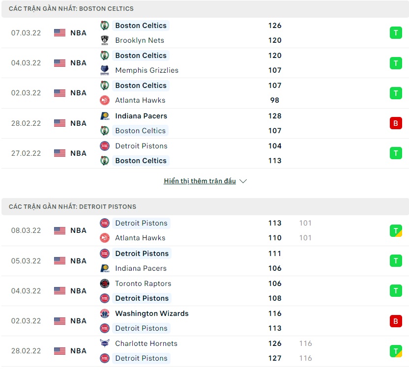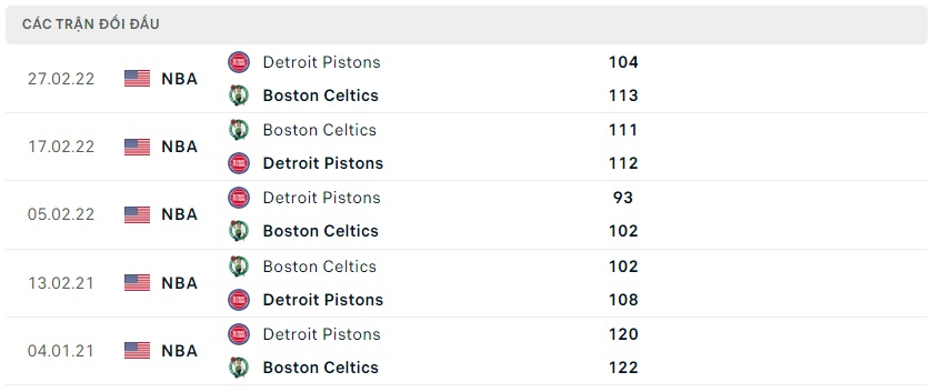 Phong độ gần đây Boston Celtics vs Detroit Pistons