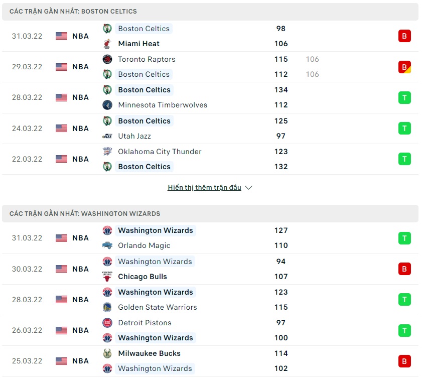 Phong độ gần đây Boston Celtics vs Washington Wizards