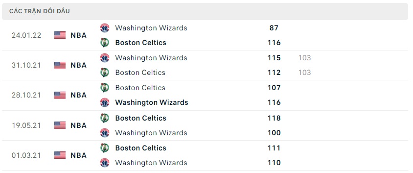 Lịch sử đối đầu Boston Celtics vs Washington Wizards