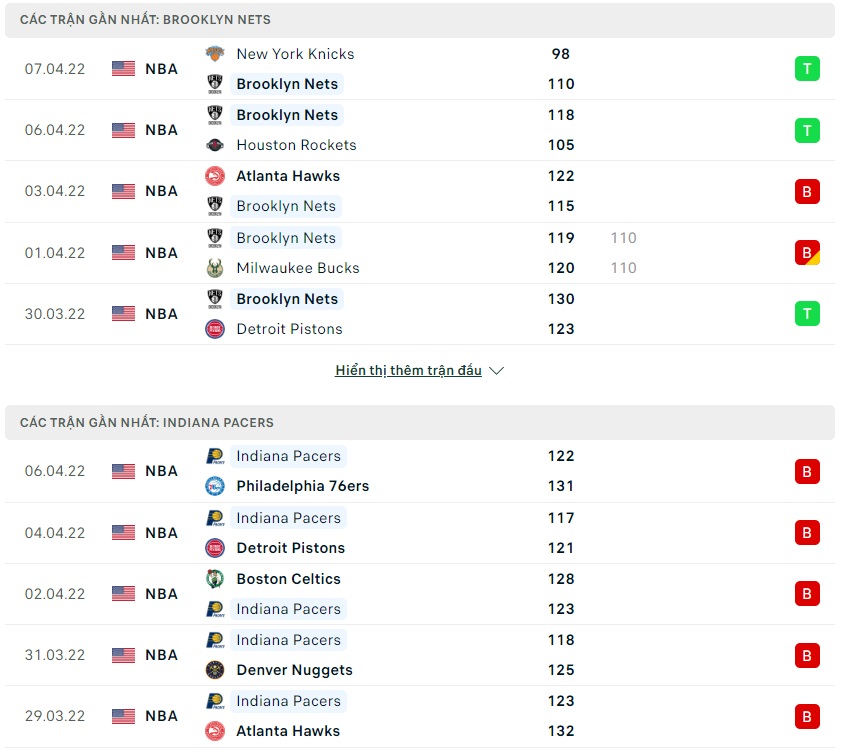 Phong độ gần đây Brooklyn Nets vs Indiana Pacers