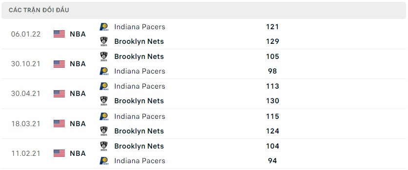 Lịch sử đối đầu Brooklyn Nets vs Indiana Pacers