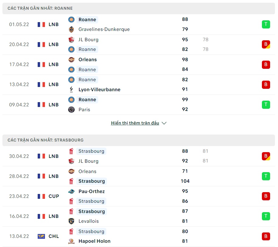 Phong độ gần đây Chorale Roanne vs Strasbourg