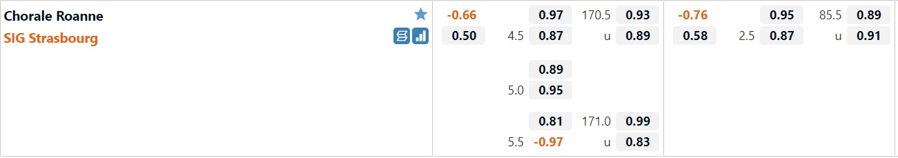 Mức điểm trung bình của của Strasbourg trong 5 trận gần đây đang chạm ngưỡng 90 mỗi trận đấu. Khả năng phòng ngự của đội bóng này cũng đang hoàn thành tốt nhiệm vụ ở đấu trường quốc nội trong khoảng thời gian gần đây. Trận đấu này có thể sẽ hướng về kèo Xỉu, khi mà Roanne khó lòng ghi được thêm một mức điểm cao như ở trận lượt đi, trước hàng thủ kín kẽ từ đội khách.