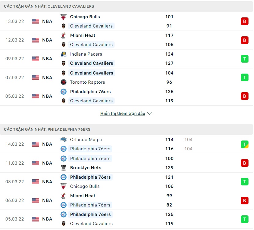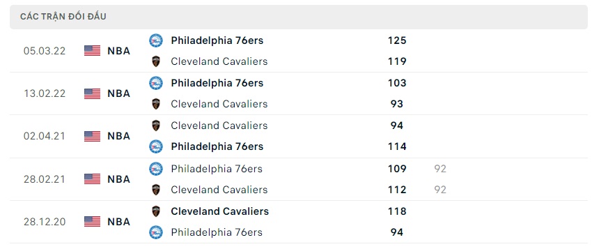 Phong độ gần đây Cleveland Cavaliers vs Philadelphia 76ers