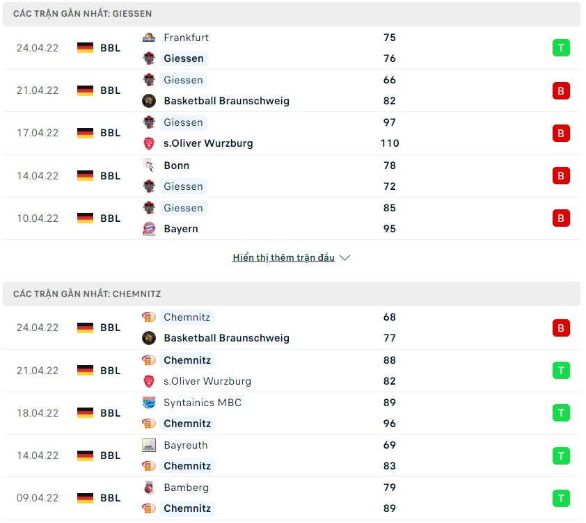 - Fulltime: Giessen 46ers 67 - 76 Chemnitz ( Xỉu )