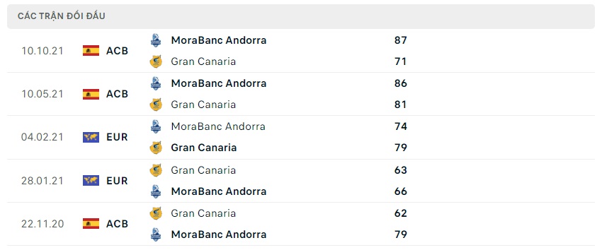 Lịch sử đối đầu Gran Canaria vs MoraBanc Andorra