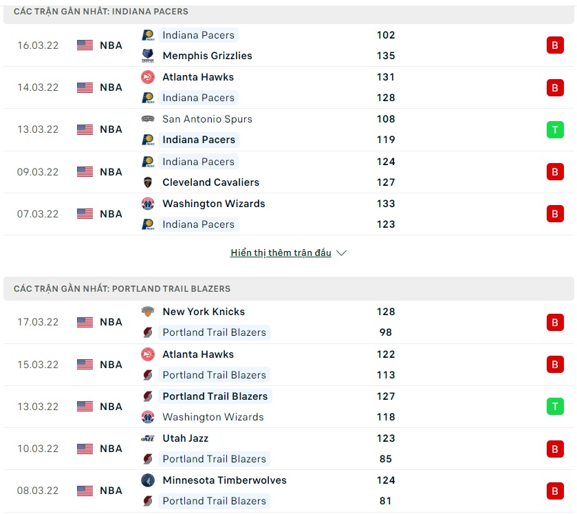 Phong độ gần đây Indiana Pacers vs Portland Trail Blazers