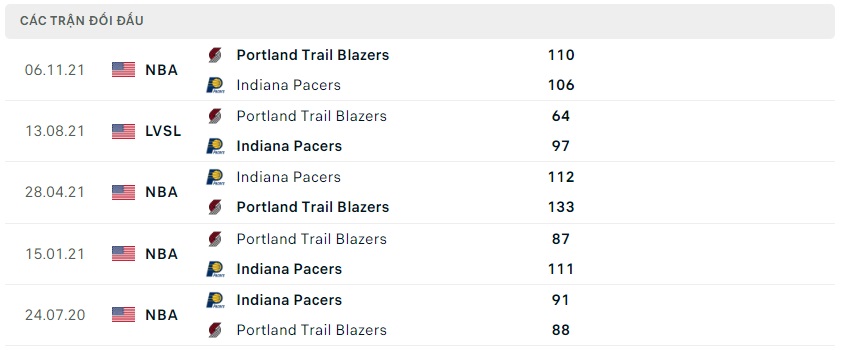 Lịch sử đối đầu Indiana Pacers vs Portland Trail Blazers