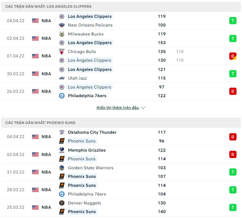 Phong độ gần đây Los Angeles Clippers vs Phoenix Suns