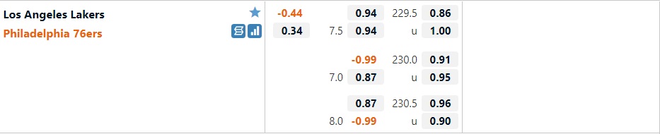 Bảng kèo Los Angeles Lakers vs Philadelphia 76ers