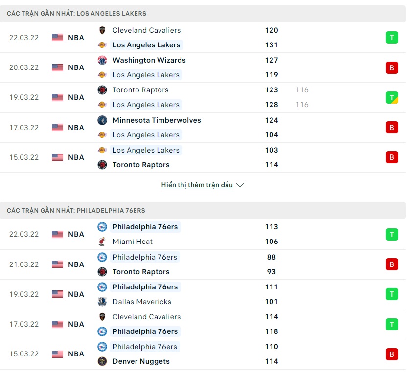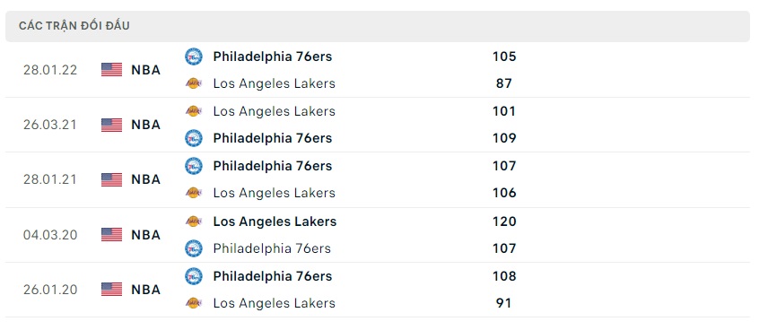 Phong độ gần đây Los Angeles Lakers vs Philadelphia 76ers