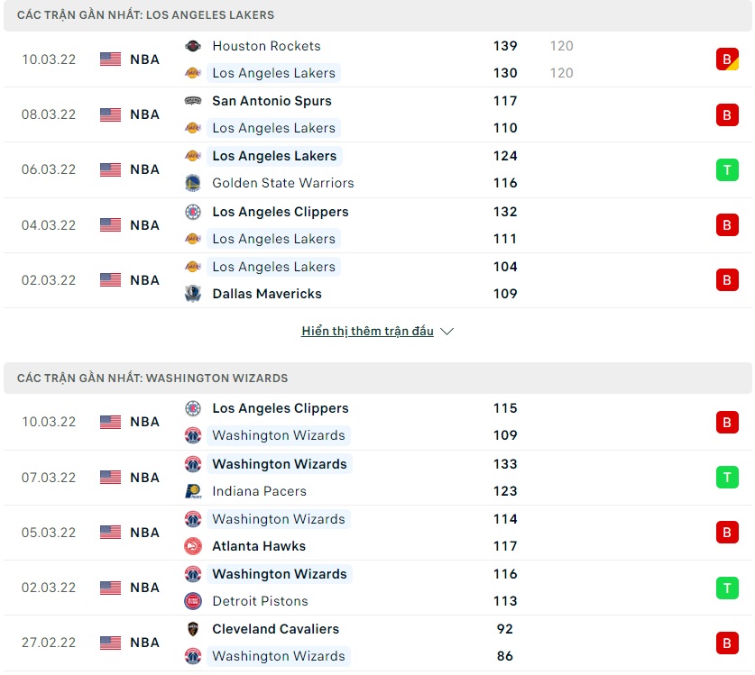 Phong độ gần đây Los Angeles Lakers vs Washington Wizards