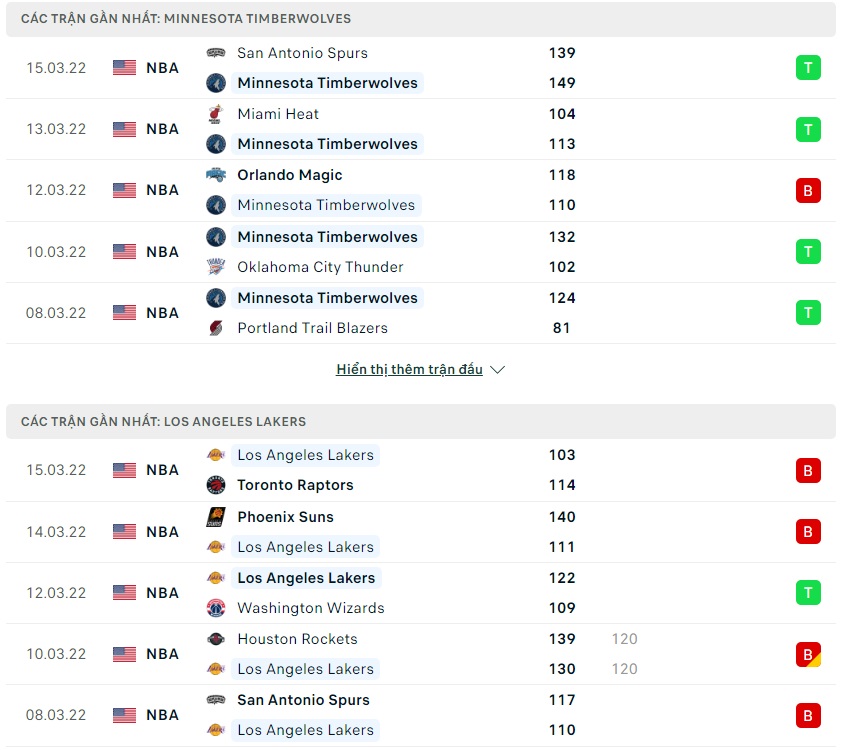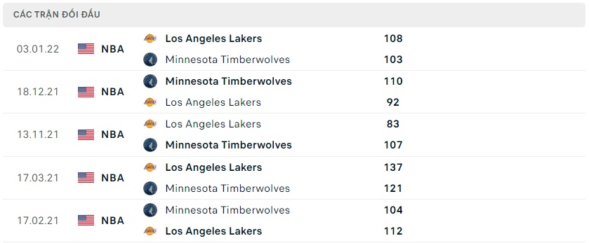 Phong độ gần đây Minnesota Timberwolves vs Los Angeles Lakers
