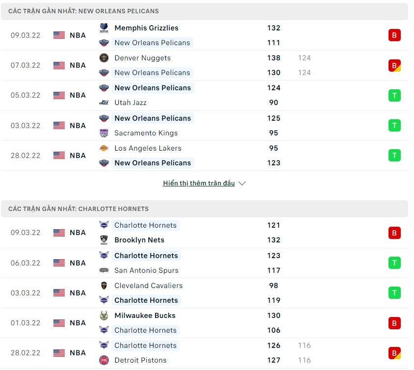 Phong độ gần đây New Orleans Pelicans vs Charlotte Hornets