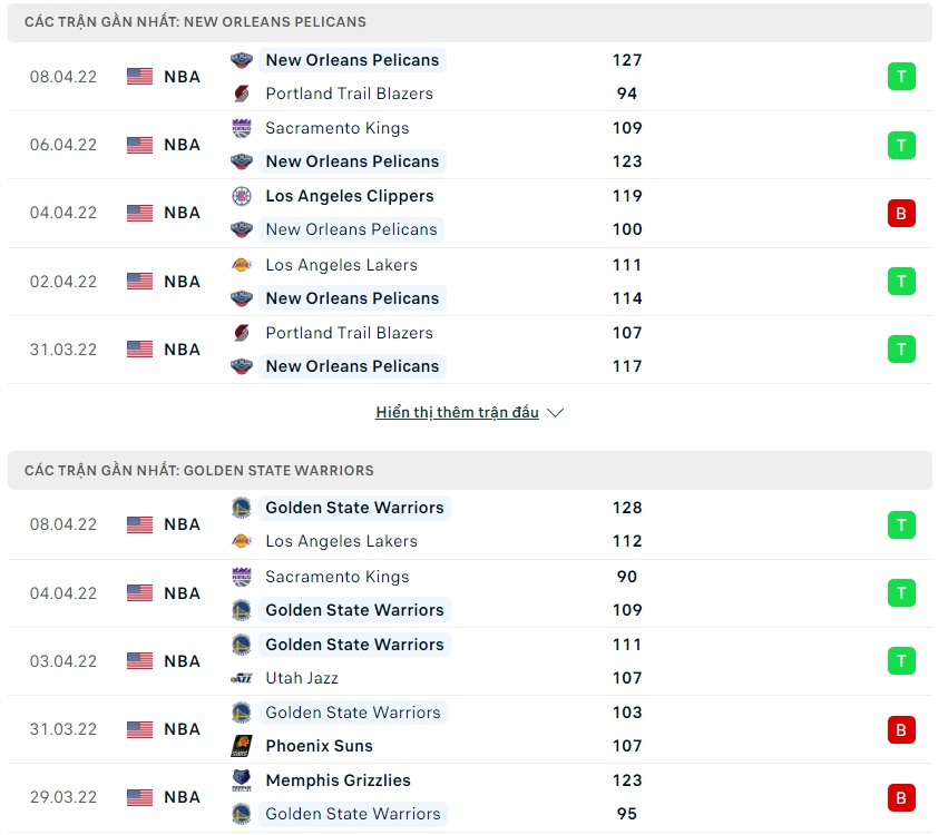 Đây là một cặp đấu cho thấy sự cân bằng trong những mùa giải gần đây, mỗi đội có được 5 chiến thắng trong 10 trận gần nhất và chẳng có đại diện nào giành được 2 thắng lợi liên tiếp. Trong mùa giải năm nay, Đàn Bồ Nông vùng Louisiana đã thắng 1 và thua 1 trước đối thủ bên kia chiến tuyến. Màn so tài gần nhất của 2 đội đã diễn ra hồi đầu tháng 1, khi đó thì những chiến binh The Bay đã phải chịu khuất phục trước Pelicans với tỷ số chung cuộc 96-101 dù được đánh giá cao hơn. Bởi vì chiến thắng gần nhất đang thuộc về Bồ Nông, họ có thể sẽ nhận thất bại nếu như cái dớp thắng thua song hành của cặp đấu này trong 10 trận gần nhất tiếp tục đeo bám. Ý nghĩa của trận đấu cuối cùng trên sân nhà trước thềm Playoff sẽ khiến Pelicans nhiều khả năng sẽ sử dụng đội hình mạnh nhất của mình, với siêu sao số 1 thời điểm này sẽ là CJ McCollum. Anh vừa có dược 23 điểm, 7 kiến tạo và 3 cướp bóng trong chiến thắng gần nhất trước Portland. Warriors thì chưa chắc sẽ đem tới trận đấu này đội hình mạnh nhất của mình, hoặc nếu có thì họ cũng sẽ giới hạn thời gian thi đấu của các trụ cột. Trong dàn kép phụ, Kuminga và Otto Porter sẽ là những cái tên đáng chú ý nhất trên mặt trận ghi điểm. Chiến thắng có thể sẽ ở lại với đội hình nhà trong trận đấu này.