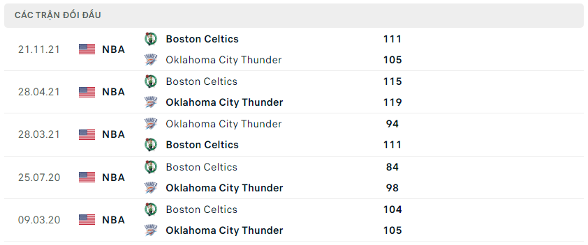Lịch sử đối đầu Oklahoma City Thunder vs Boston Celtics