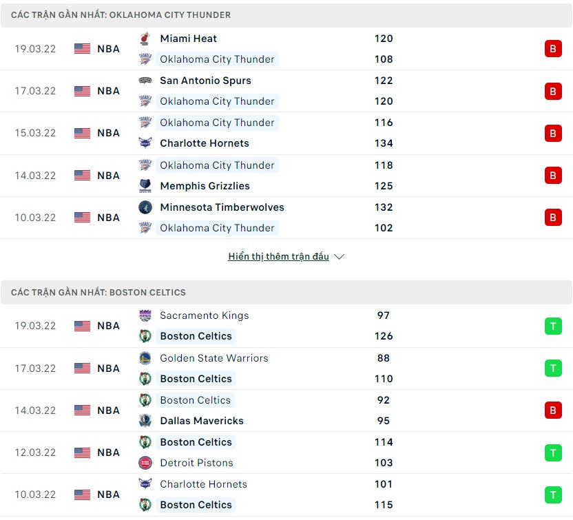 Phong độ gần đây Oklahoma City Thunder vs Boston Celtics