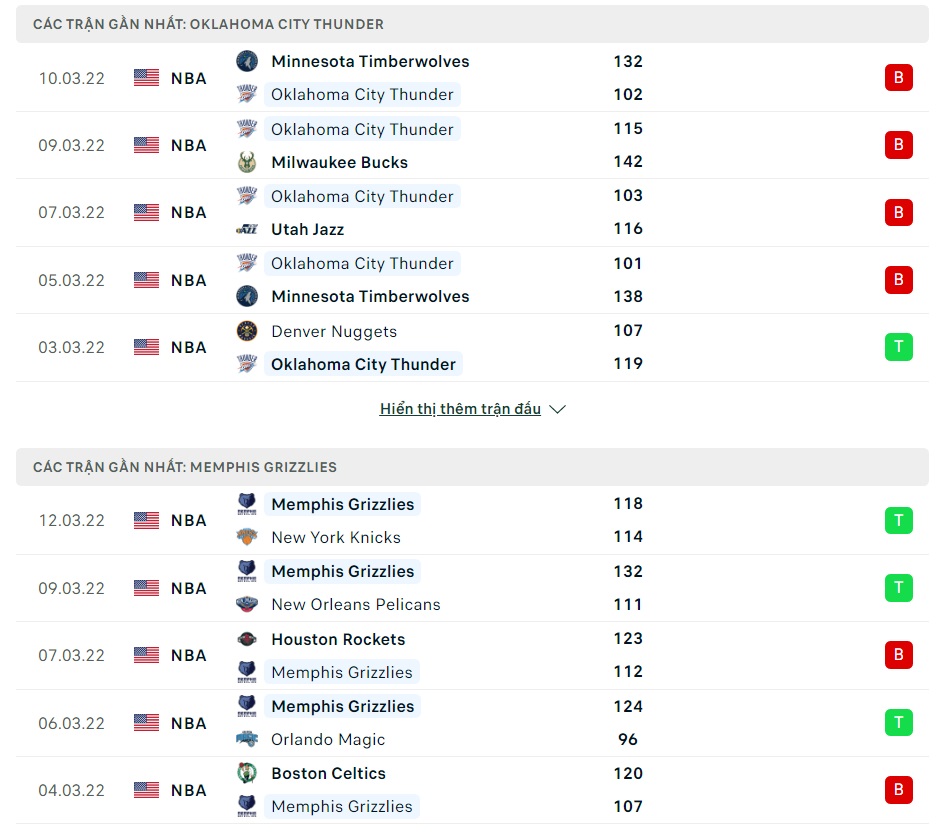 Phong độ gần đây Oklahoma City Thunder vs Memphis Grizzlies